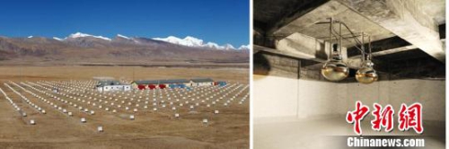 中国西藏羊八井ASgamma实验(左图:ASgamma表面阵列;右图:地下水切伦科夫探测器)。中科院高能所
