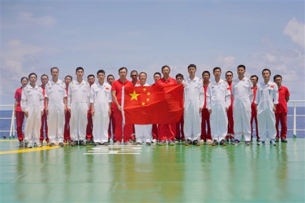 11时40分,西太平洋海面波光粼粼,晴空万里。“科学”号海上堡垒临时党支部全体党员、入党积极分子列队整齐,迎接穿越赤道的时刻。仪式在雄壮的国歌声中开始,全体人员面向五星红旗齐唱国歌,跨越赤道进入南半球。