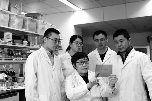 曹晓风和获奖团队成员正在解析实验结果(前排为曹晓风,后排左起:刘斌、刘春艳、宋显伟、陆发隆)。曹晓风供图