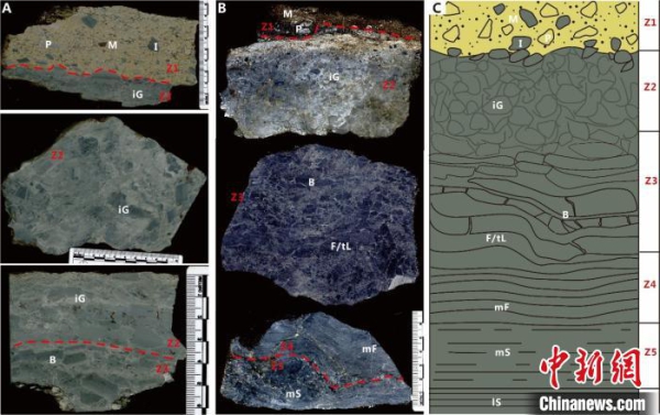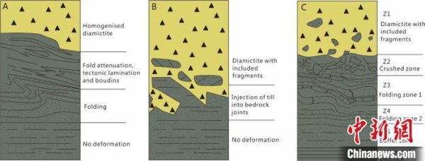 科研人员介绍,铁丝坳/东山峰组底部的变形构造可自上而下分为5个变形区(Z1-Z5),从Z1到Z5显示出逐渐减弱的变形特征,表明造成变形的应力来自上覆冰盖的运动。