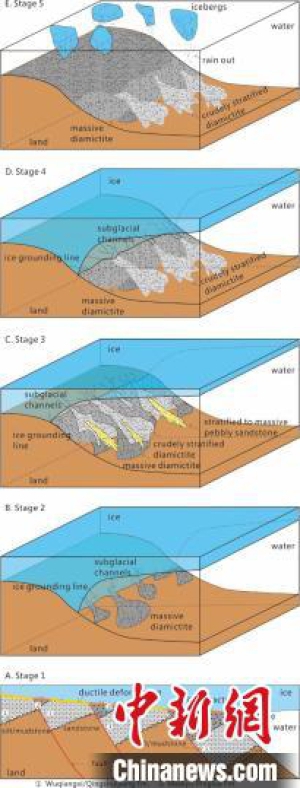 研究发现,其沉积过程可分为5个阶段:第1阶段记录了冰盖与下伏地层的相互作用,下文提到的冰川构造变形即发生在这一阶段;第2-4阶段代表了冰盖的前进-后退-前进过程,第5阶段为最终冰消期。亦即是说铁丝坳/东山峰组沉积记录了至少两次冰川进退过程,说明该时期的冰盖是不稳定的。