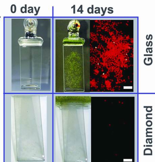 将无镀膜石英玻璃和仿生金刚石薄膜浸泡于生长绿藻的海水环境中,14天前后的照片和荧光显微镜图像对比。