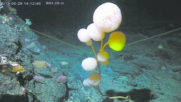 海洋所长茎海绵(新种)高达450厘米,长茎秆上生有多个分支,顶端具蘑菇状的小海绵体,隶属六放海绵纲、松骨海绵目、花骨海绵科。2017、2019年发现于西太平洋卡罗琳海山859~1054米深的岩石上。