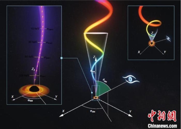 “慧眼卫”星发现了离黑洞最近的喷流产生的准周期调制信号的艺术想象示意图。(中科院高能所“慧眼”卫星团队 供图)