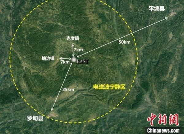 “中国天眼”方圆5公里的范围被划为“电磁波宁静保护区”。早在2013年,贵州官方发布《贵州省500米口径球面射电望远镜电磁波宁静区保护办法》,分3个区域按照不同要求对“中国天眼”台址周边的电磁环境进行保护。