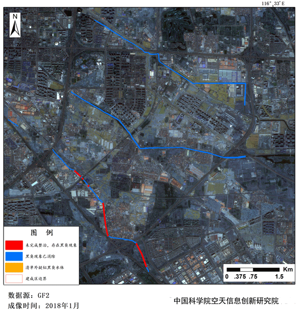 遥感数据显示,随着时间推移,某区域内的黑臭河段长度不断减小(图片由中科院空天信息创新研究院提供)