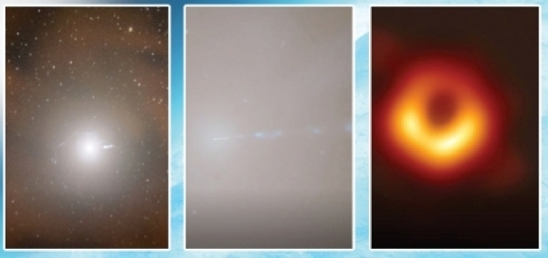 从左到右,为M87星系、M87黑洞喷流、首张黑洞流量总强度照片