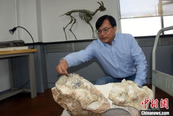 中科院古脊椎所研究员邓涛介绍700万年前的真板齿犀(原始板齿犀)化石标本。中新社记者 孙自法 摄