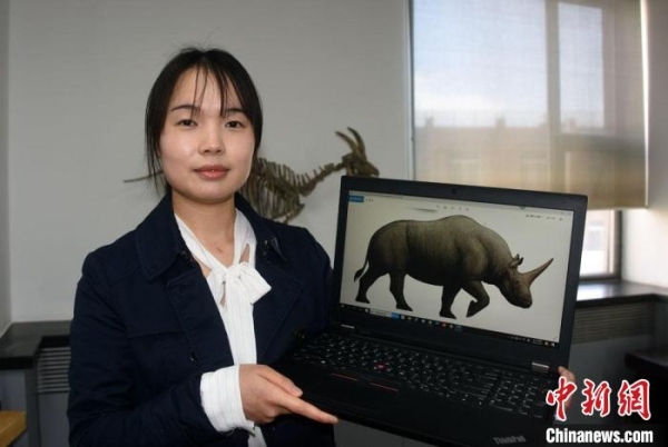 中科院古脊椎所博士研究生孙丹辉展示介绍700万年前真板齿犀(原始板齿犀)化石复原图。中新社记者 孙自法 摄