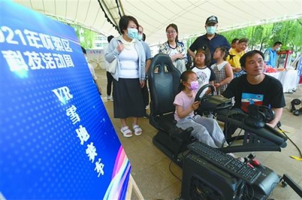 北京市怀柔区科技活动周现场,市民正在体验VR雪地赛车。主办方供图