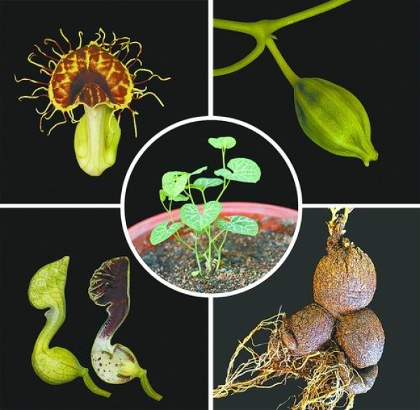 流苏马兜铃(①花②小苗③果④花的切面⑤根)。中科院植物所供图