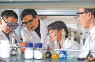 包信和(左二)与团队成员在实验室。谢震霖摄