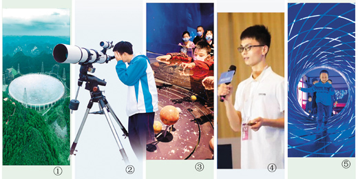 图①:“中国天眼”全景 新华社记者 欧东衢摄 图②:平塘县民族中学天文社观测活动 受访者供图 图③:在平塘国际天文体验馆参观的孩子 刘朝富摄 图④:2018年,刘章韬在贵阳举办的国际大数据产业博览会上演讲 受访者供图 图⑤:孩子们在平塘国际天文体验馆体验“穿越黑洞” 刘朝富摄