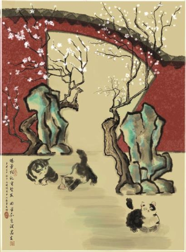 仇子龙实验室助理研究员杨侃与青年画家邱永智共同创作了一幅国画,形象展示了这一深奥的机理:中国式扇形拱门很像压后皮层,苏式园林假山也与大脑相像,未开放的腊梅花苞则代表未成熟的树突棘,开放的梅花代表成熟的树突棘。当SENP1基因剂量不足时,就像这棵树干被劈开一半的腊梅,本该怒放的花朵大量停留在了花骨朵阶段。而且,当SENP1基因剂量不足时,大脑皮层变宽变厚,就像劈开一半的腊梅旁边变大的假山。同时,这些表型与社交记忆受损相关,就像画中正常小猫会相互打闹嬉戏,而SENP1基因剂量不足的小猫,无法与伙伴社交互动。