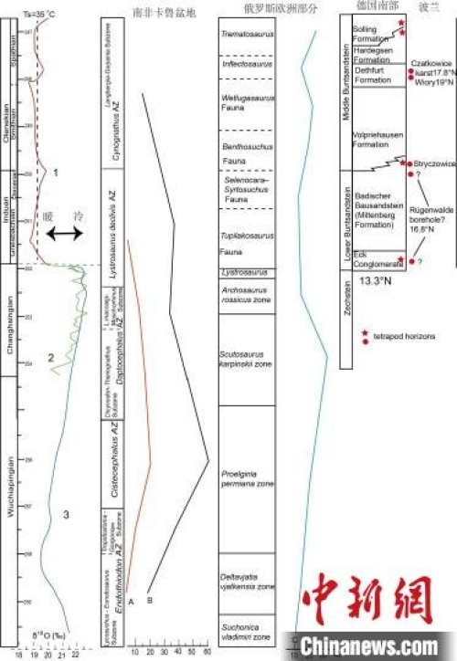 记者从中国科学院古脊椎动物与古人类研究所获悉,该所刘俊研究员近年来和国外同行合作,通过仔细分析二叠纪到三叠纪转折时期(距今约2.6亿年-2.47亿年)的全球四足动物记录,最新研究揭示二叠纪晚期(距今约2.58亿年)的全球降温事件以及最末期(距今约2.52亿年)开始的升温事件如何塑造当时的四足动物分布格局。