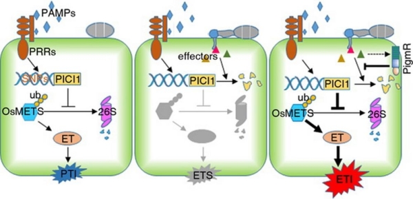 研究团队综合运用植物病理学、植物遗传学、分子生物学和生物化学等实验技术平台,鉴定到一个新的水稻免疫调控蛋白PICI1,并揭示了一条全新的植物防卫代谢通路。水稻进化产生的广谱抗病NLR受体,可以通过抑制病原菌毒性蛋白与PICI1的互作,保护并加强PICI1的功能,进而激活更多的防卫化学物质(蛋氨酸—乙烯)的合成,以获得广谱抗病性。