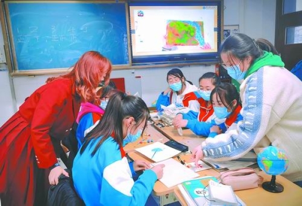 当讲到“地转偏向力”时,她的眼睛一刻都没有离开过讲台下的学生。这是在高二选修课本上才会出现的知识点,晦涩难懂,因此张雯婕格外留心同学们的反应。讲完知识点后,她把提前准备好的沙盘材料发给大家,让他们以小组为单位设计一条河流。“你们要考虑到河流设计的合理性哦!”张雯婕微笑地提醒同学们注意地转偏向力对河流走向的影响。