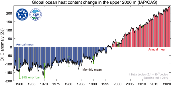 1958年至2021年全球海洋上层2000米热含量变化时间序列。(中科院大气物理研究所供图)