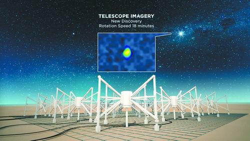 2018年初,张翔与Hurley-Walker等通过分析位于澳大利亚的SKA低频先导望远镜默奇森宽场阵列(MWA)的巡天观测数据,发现了一个具有异常缓慢周期性辐射的致密暂现源。