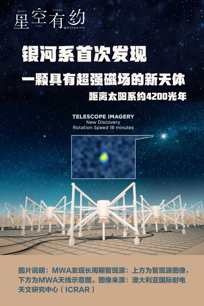 中国科学院上海天文台科研人员张翔与澳大利亚合作者、科廷大学国际射电天文研究中心(ICRAR-Curtin)的Hurley-Walker博士等中外科研人员,通过分析MWA的巡天观测数据,意外地发现一颗位于银河系内具有超强磁场的新天体—一个具有异常缓慢周期性辐射的射电暂现源。
