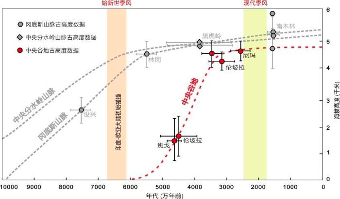 约3800万-2900万年前,以伦坡拉盆地为代表的中央谷地快速隆升为海拔超过4000米的高原,标志着青藏高原主体部分形成。伴随中央谷地隆升和全球气候变冷,高原中部温度显著下降,降水减少,并且南部季风作用相对增强。气候变化导致高原中部从温暖湿润的亚热带生态系统转变为寒冷干燥的高寒生态系统,主要地表植被演变为高山草甸。