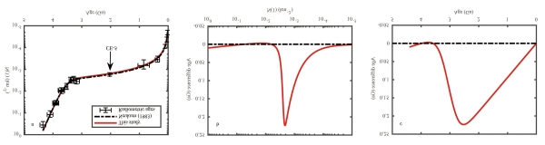 新月球年代模型及其与Neukum(1983)模型的差异。a.月球年代模型对比,红色实线表示新年代函数模型,黑色虚线表示Neukum(1983)模型;b.不同撞击坑归一化频率对应的年龄差异;c.不同地质时间对应的年龄差异