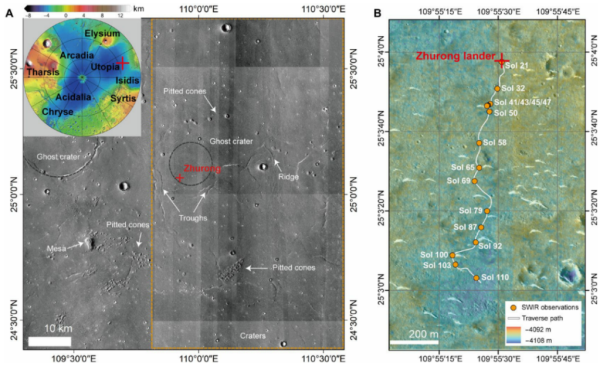 (A)祝融号着陆点地貌图。(B)祝融号巡视路线图。(中科院国家空间科学中心供图)