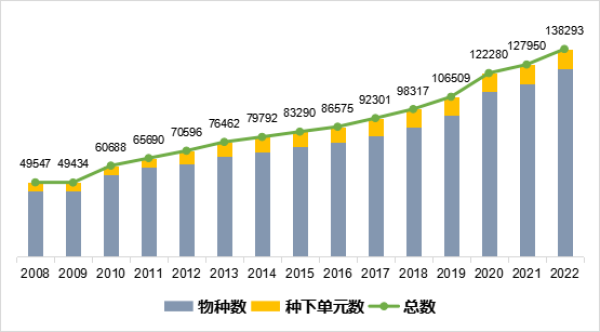《中国生物物种名录》2022版共收录物种及种下单元138293个,其中动物部分68172个,植物部分46725个,真菌部分17173个,原生动物界2566个,色素界2383个,细菌界469个,病毒805个。