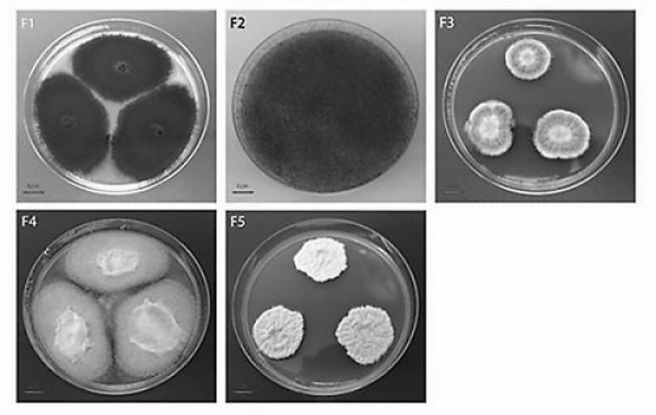 内霉葵花籽中分离到的真菌菌落:F1为链格孢属菌(优势菌);F2为根霉;F3为萨氏曲霉;F4为黄曲霉;F5为白曲霉。课题组供图