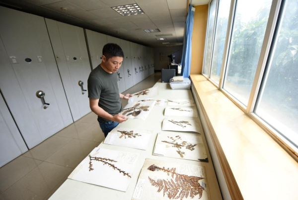 胡君在中科院成都生物研究所标本馆内查阅标本(8月17日摄)。新华社记者 刘坤 摄