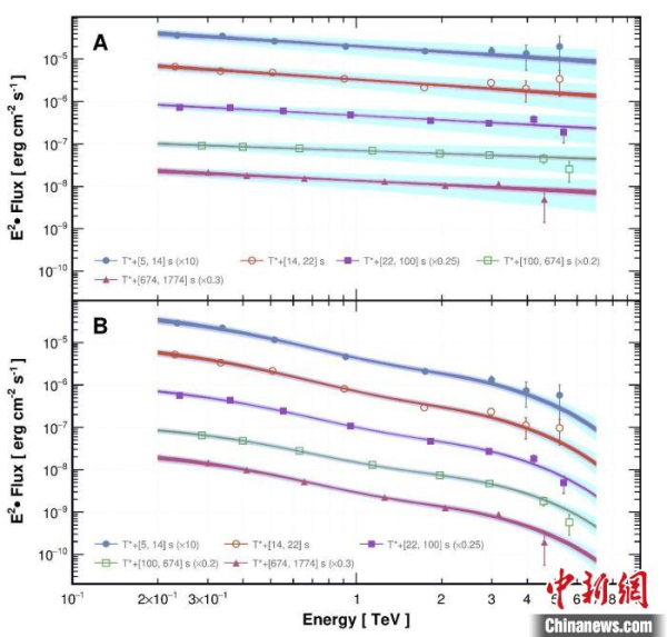 “拉索”测量得到的GRB221009A在5个时间段的本征谱与观测谱,约在2千亿到7万亿电子伏特之间。中科院高能所 供图