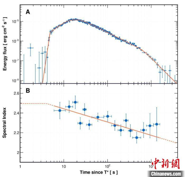 “在‘后随爆炸’过程中,‘拉索’首次探测到光子流量的极速增强。”论文通讯作者之一、中科院高能所研究员姚志国指出,不到两秒的时间内流量增强了100多倍,之后的缓慢增长行为却符合后随爆炸的预期特征。