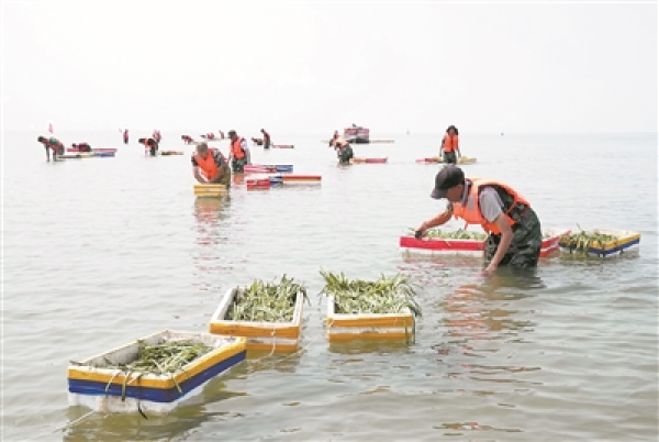 中船环境集团的工人在唐山市曹妃甸区海洋生态保护与修复项目海域栽种鳗草苗。新华社记者 杨世尧摄