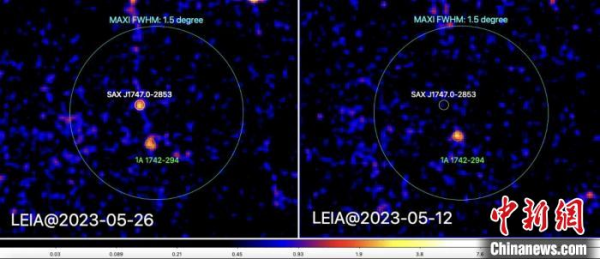 LEIA捕获到的银河系中心中子双星的耀发现象(左图为2023年5月26日探测图像,右图为2023年5月12日探测图像),LEIA还实现对最大尺度星系团——室女座Virgo星系团(10°×10°)的弥散源成像观测,这是中国科学家首次用自己的望远镜绘制的X射线图像。中国科学院卫星创新院供图