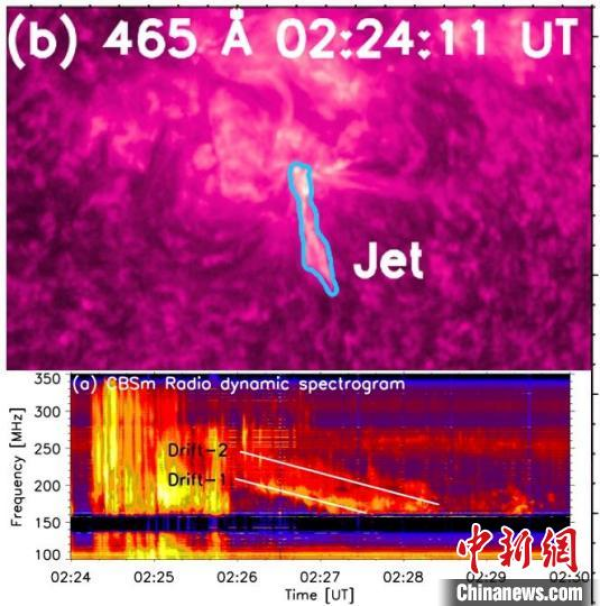 SUTRI观测到的一个喷流及其驱动的二型射电暴(来自太阳射电槎山观测站)。中国科学院卫星创新院供图