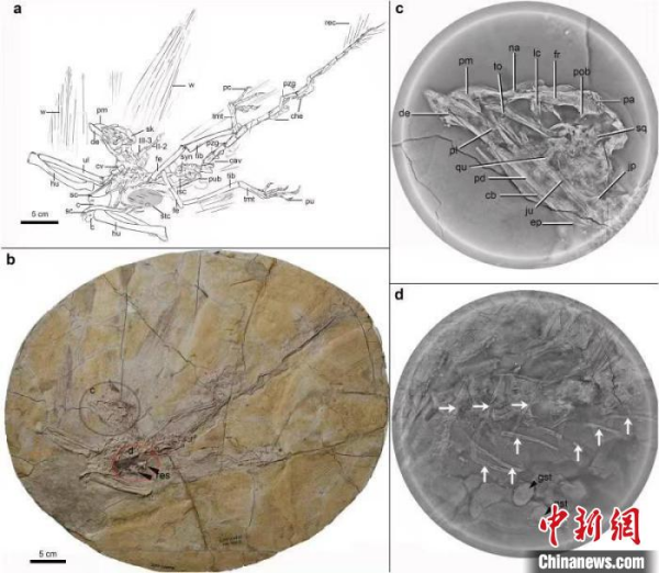 热河鸟标本(IVPP V14978)的线描、摄影和扫描。中国科学院古脊椎所供图