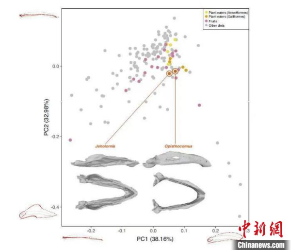 包括热河鸟和现存鸟类在内的三维下颌形状PCA图,重点与现存植食性鸟类对比。中国科学院古脊椎所供图