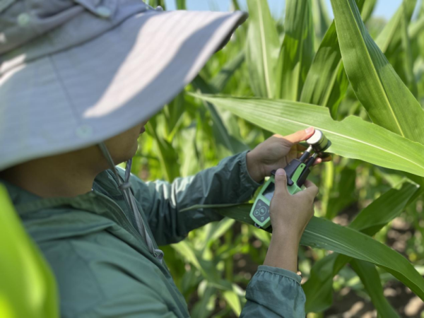 科研人员在田间测植株叶绿素含量。(受访者供图)