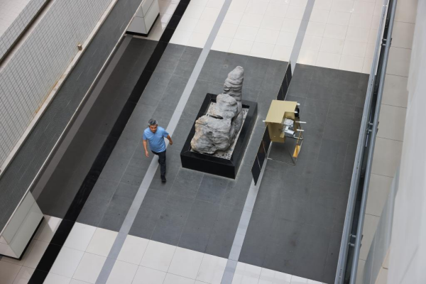 7月21日,在位于安徽合肥的中国科学技术大学,彭承志经过放在大厅里展示的“墨子号”模型。