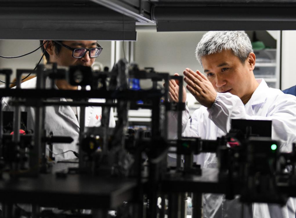 7月21日,在位于安徽合肥的中国科学技术大学,彭承志在实验室与学生交流实验进展。