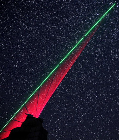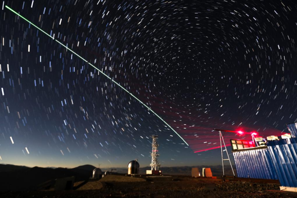 “墨子号”量子科学实验卫星与阿里量子隐形传态实验平台建立天地链路(2016年12月9日摄,合成照片)。