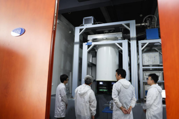 在位于上海张江的上海量子科学研究中心,彭承志(左二)和团队成员在“祖冲之二号”前讨论研究进展(7月22日摄)。