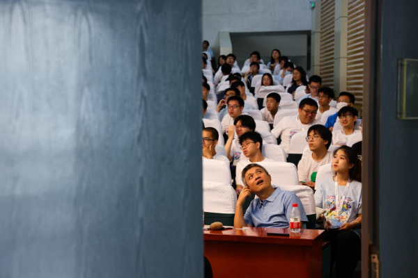 7月21日,在位于安徽合肥的中国科学技术大学报告厅,彭承志准备给参加第十四届物理与化学夏令营微尺度分营的学生作报告。