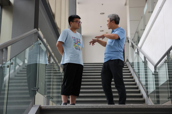 7月21日,在位于安徽合肥的中国科学技术大学,彭承志(右)在实验室与学生交流实验进展。