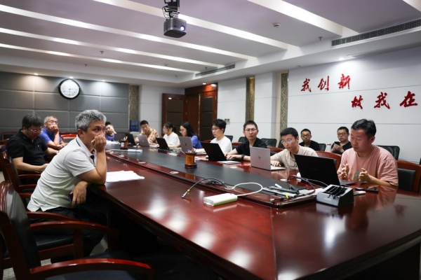 7月22日,在中国科学技术大学上海研究院,彭承志(左)在参加组会时听取汇报。