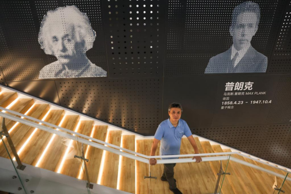 彭承志在科大国盾量子技术有限公司楼梯前留影(7月22日摄)。
