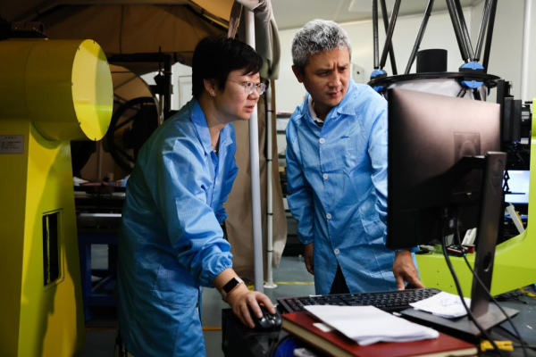 7月22日,在中国科学技术大学上海研究院实验室,彭承志(右)与印娟教授在查看实验数据。