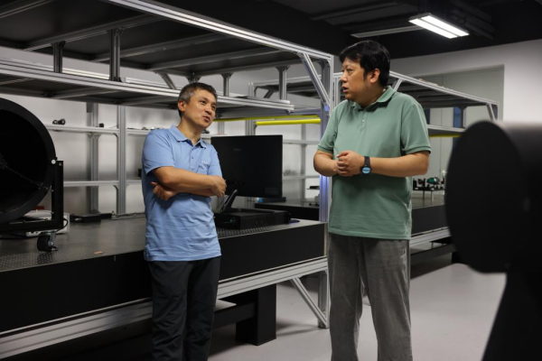 7月21日,在位于安徽合肥的中国科学技术大学先进技术研究院,彭承志(左)与任继刚教授交流卫星地面站运行情况。