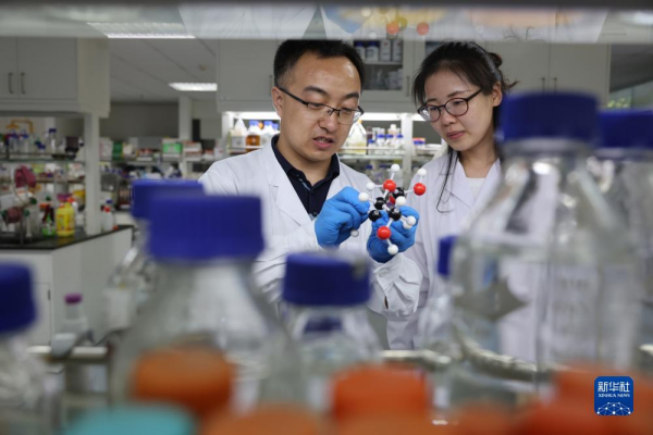 在中国科学院天津工业生物技术研究所实验室,杨建刚副研究员(左)和宋皖博士在讨论工作进展(8月13日摄)。新华社记者 金立旺 摄