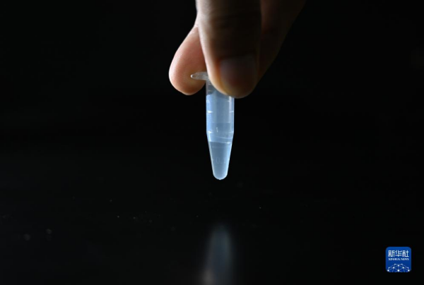 在中国科学院天津工业生物技术研究所实验室拍摄的一份人工合成己糖溶液样品(8月13日摄)。新华社记者 孙凡越 摄